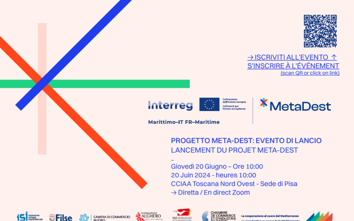 Giovedì 20 giugno 2024, alle ore 10.00, presso la Sala Pacinotti della Camera di Commercio Toscana Nord Ovest si terrà l’evento di lancio del progetto META-DEST - La Destinazione Multi-Piattaforma per l’Innovazione del Turismo, un progetto co-finanziato dal Programma Interreg Italia-Francia Marittimo 2021-2027, che vede capofila la Fondazione per l’Innovazione e lo Sviluppo Imprenditoriale di Pisa, con i partner: Finanziaria Ligure per lo Sviluppo Economico (FILSE), Camera di Commercio di Nuoro con il Distretto Culturale del Nuorese, Fondazione Alghero, Toulon Var Tecnologies (TVT), Camera di Commercio e Industria della Corsica.