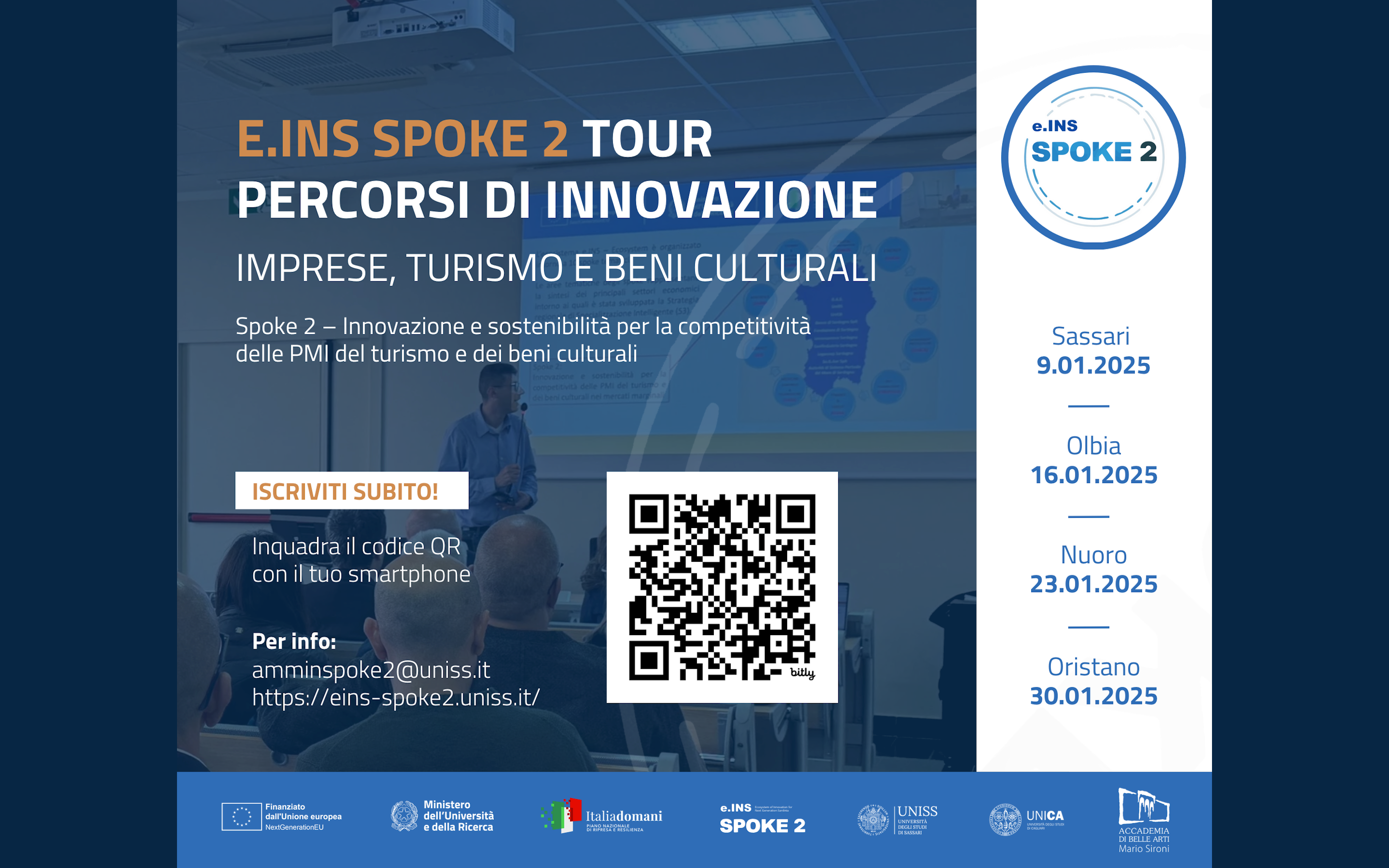 Lo Spoke 2 dell’ecositema e.INS-Ecosystem of Innovation for Next Generation Sardinia, progetto coordinato dall’Università di Sassari e finanziato dal PNRR per rafforzare la collaborazione tra il mondo scientifico e l’impresa – organizza una serie di incontri su tutto il territorio regionale rivolti ad imprese e operatori del territorio (PMI, start-up, incubatori d’impresa, associazioni di categoria, enti locali, GAL, FLAG, parchi nazionali e regionali, scuole e comunità locali) con l’obiettivo di sostenere e promuovere progetti innovativi e partecipativi nelle filiere del turismo e dei beni culturali, facendo leva su innovazione, trasferimento tecnologico e sostenibilità.