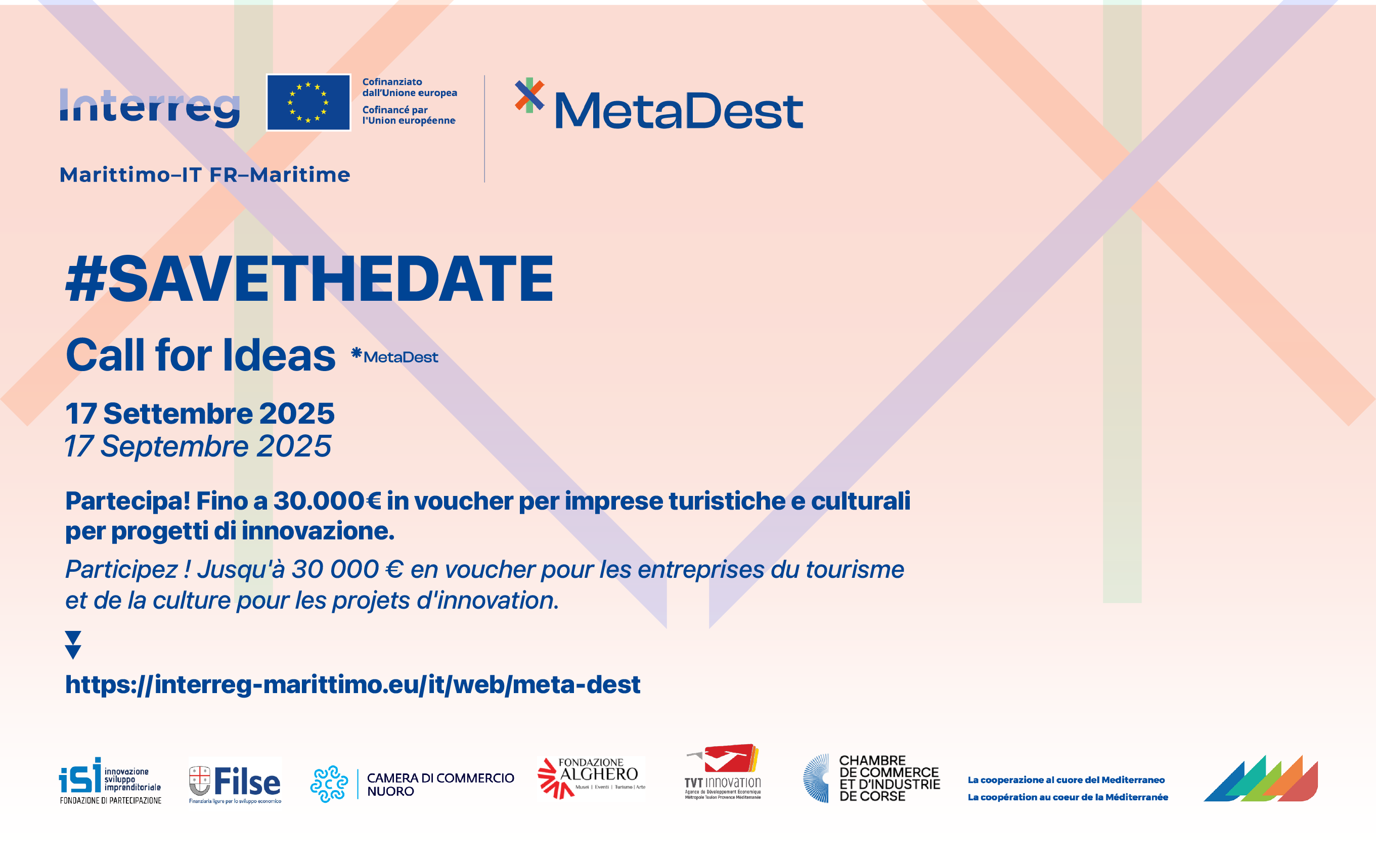È prevista per mercoledì 17 settembre l’apertura della Call for Ideas promossa dal progetto META-DEST dedicata alle imprese delle filiere del turismo e della cultura dei territori del Programma Marittimo. META-DEST - La Destinazione Multi-Piattaforma per l’Innovazione del Turismo, è un progetto co-finanziato dal Programma Interreg Italia-Francia Marittimo 2021-2027, vede capofila la Fondazione per l’Innovazione e lo Sviluppo Imprenditoriale di Pisa, con i partner: Finanziaria Ligure per lo Sviluppo Economico (FILSE), Camera di Commercio di Nuoro, Fondazione Alghero, Toulon Var Tecnologies (TVT), Camera di Commercio e Industria della Corsica.