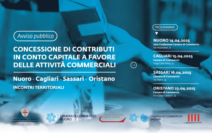 La Camera di Commercio informa che Lunedì 14 aprile ore 10:30, in presenza dell'Assessore del Turismo, Artigianato e Commercio, Franco Cuccureddu, è in programma l’incontro territoriale volto ad illustrare le opportunità dell’Avviso pubblico per la concessione di contributi in conto capitale a favore delle micro, piccole e medie imprese (MPMI) del comparto commerciale, nell’ambito delle misure regionali di sostegno al commercio, con una dotazione complessiva di 35,5 milioni di euro, stanziata dalla Regione Autonoma della Sardegna e promossa da Unioncamere Sardegna, in collaborazione con le Camere di Commercio dell’Isola.