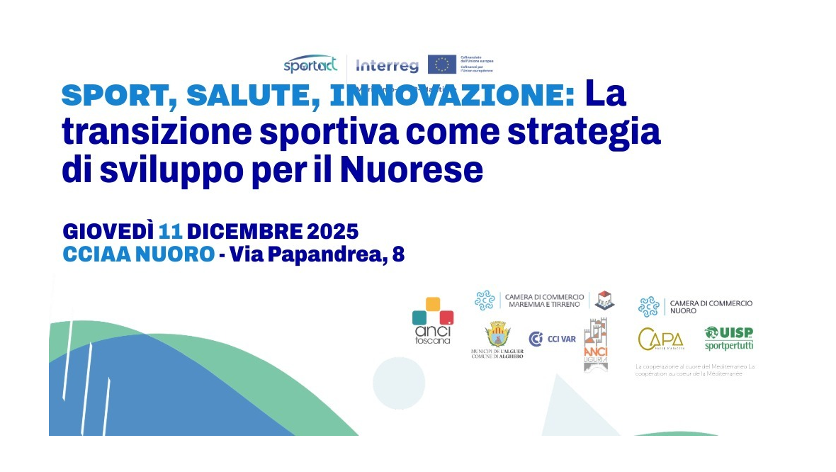 La Camera di Commercio di Nuoro, in qualità di partner del progetto europeo Sport Act finanziato dal Programma Interreg Italia–Francia Marittimo 2021–2027, organizza giovedì 11 dicembre 2025, presso la sede camerale, il Forum “Sport, Salute, Innovazione: la transizione sportiva come strategia di sviluppo per il Nuorese”.