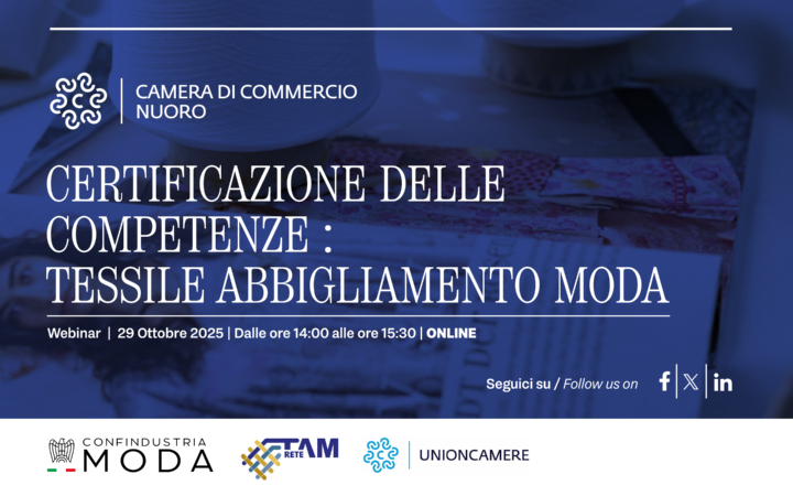 La Camera di Commercio di Nuoro invita scuole, imprese e operatori del settore a partecipare al webinar di presentazione e aggiornamento del percorso “Certificazione delle competenze – Tessile Abbigliamento Moda”, promosso nell’ambito della collaborazione tra rete di scuole TAM, Confindustria Moda, Confindustria Accessori Moda e Unioncamere.